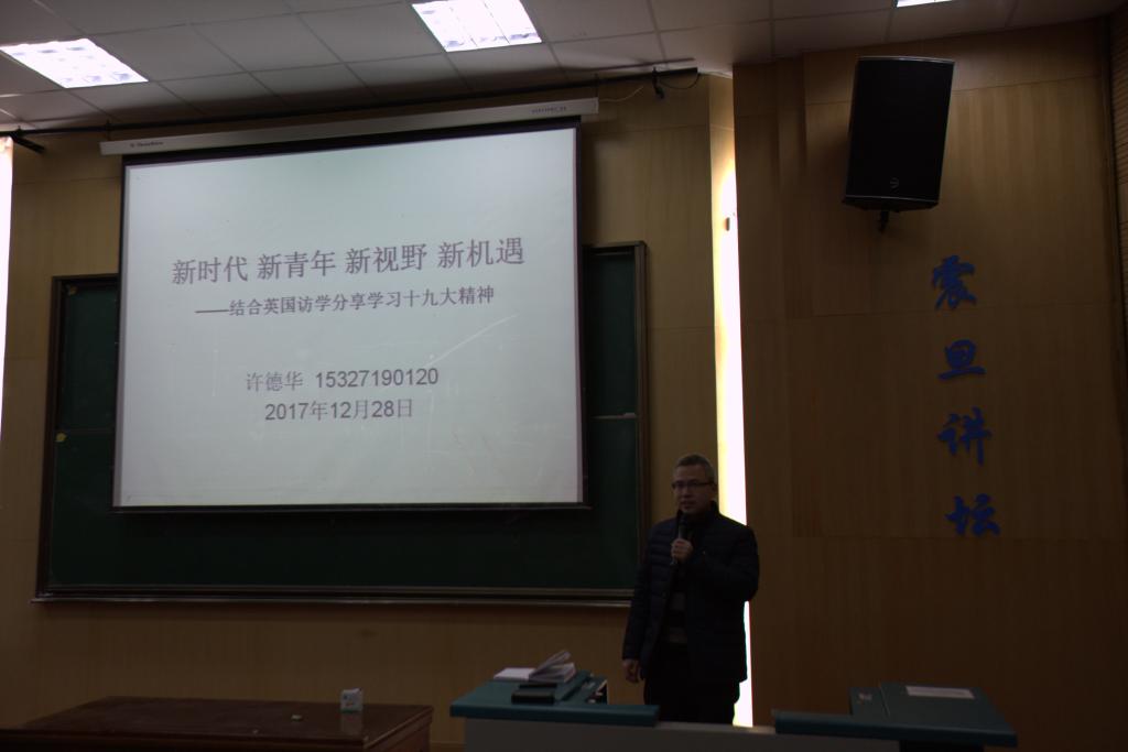 拥抱新时代,需要新眼界。许德华同志结合其英国访学的经历,告诉广大青年学子:要主动融入新时代、把握新时代,要主动学习新思想、贯彻落实新思想,要通过悦读、传承弘扬中华文化,要深刻领会社会主义核心价值观、自觉践行中国价值。最重要的是,我们一定要不忘初心,牢记使命,坚定信念跟党走,只有这样,我们才能真正担负起实现民族复兴的伟大使命。