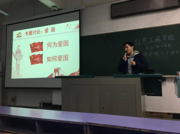 第六组王仁政同学结合自己现在的研究生身份谈了如何爱国以及对自己对他人都要诚信的准则。