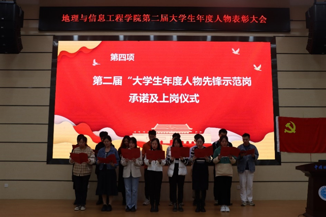 大会设定“大学生年度人物”先锋示范岗承诺及上岗仪式。本次获奖个人和团队集体亮相,承诺从亮身份、做表率、树形象三个方面坚定理想信念,练就过硬本领,坚决做到组织有号召必有响应,进一步发挥先锋模范作用和朋辈引领作用。