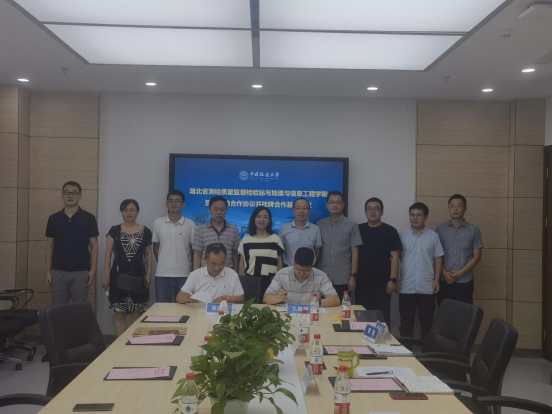 (武汉)“湖北省测绘质量监督检验站-大学生实习实践基地”揭牌。与会人员见证了协议签订仪式并合影留念。