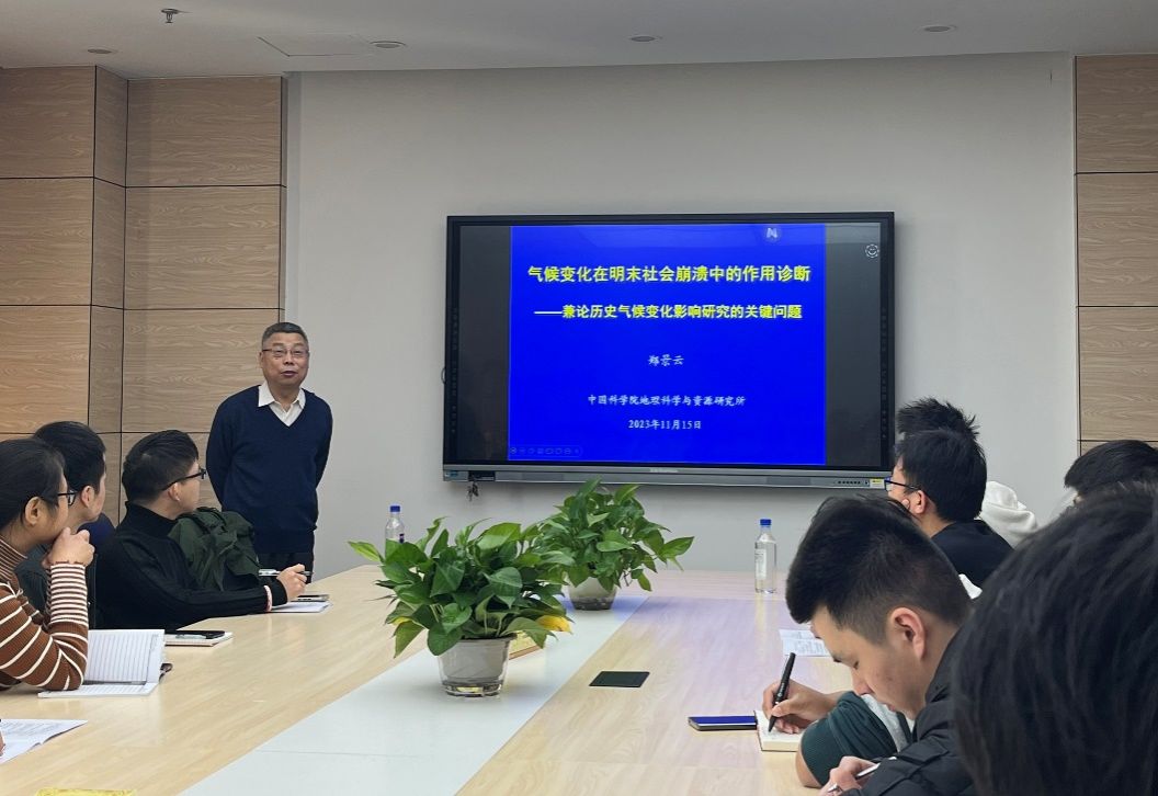 交流,并在405会议室作题为“气候变化在明末社会崩溃中的作用诊断——兼论历史气候变化影响研究的关键问题”的学术报告,报告由胡超涌教授主持。