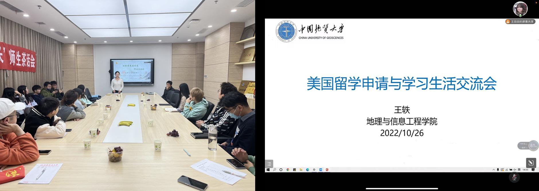 此次茶话会以“美国留学申请与学习生活交流会”为题,由环境遥感团队党支部支部书记、“地大百人”王轶教授主讲,旨在帮助同学们更好的了解留学情况,把握升学就业机会。茶话会由环境遥感团队党支部副书记王田田主持,采用线上线下相结合的方式,吸引了来自黄色直播