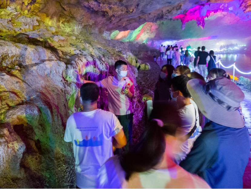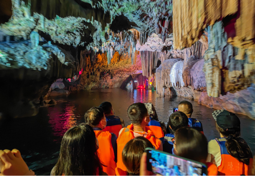 在洞中,师生先后以步行、乘船与乘小火车三种方式行进,只见洞内景观丰富多彩,独特的岩溶地貌造型各异,巨大的钟乳石群在荧光灯照射下,显得流光溢彩。在一处处自然岩溶地貌景观前,指导老师认真地向学员们介绍着地下岩溶地貌的识别并分析其成因,学员们纷纷驻足聆听,做着详细记录,时而针对自己的理解进行交流分享,学习交流氛围浓烈。