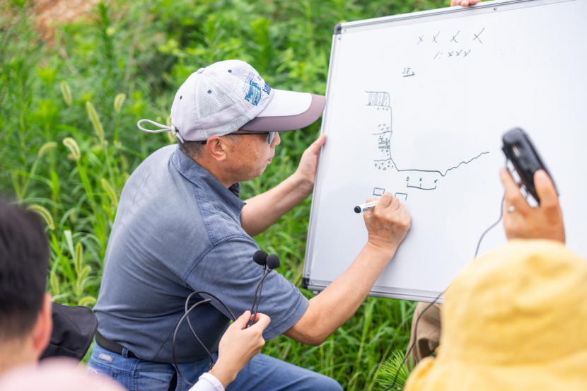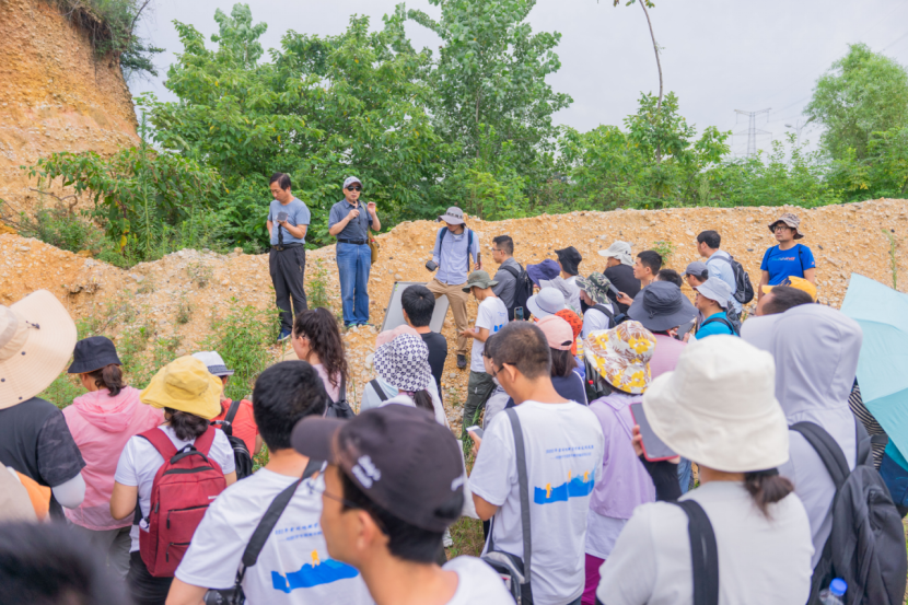 7月11日,培训班全体成员来到武汉市长江北岸阳逻镇的阳逻砾石层,在一处丘陵化的高阶地前,分布着最大厚度可达10余米的砾石层。李长安教授介绍了阳逻砾石层的研究历史和第四纪地层划分的野外工作方法。在学员们进行分组观察后,李长安教授集中分析了砾石的岩性、形态、倾向等特征,对剖面自上而下依次排布的网纹红土(Q2)、砾石层(Q1)、公安寨组(K-E)基岩进行了介绍,结合区域地质背景,尝试分析了阳逻砾石层可能物源。最后,就如何绘制砾石层剖面素描图进行了示范。