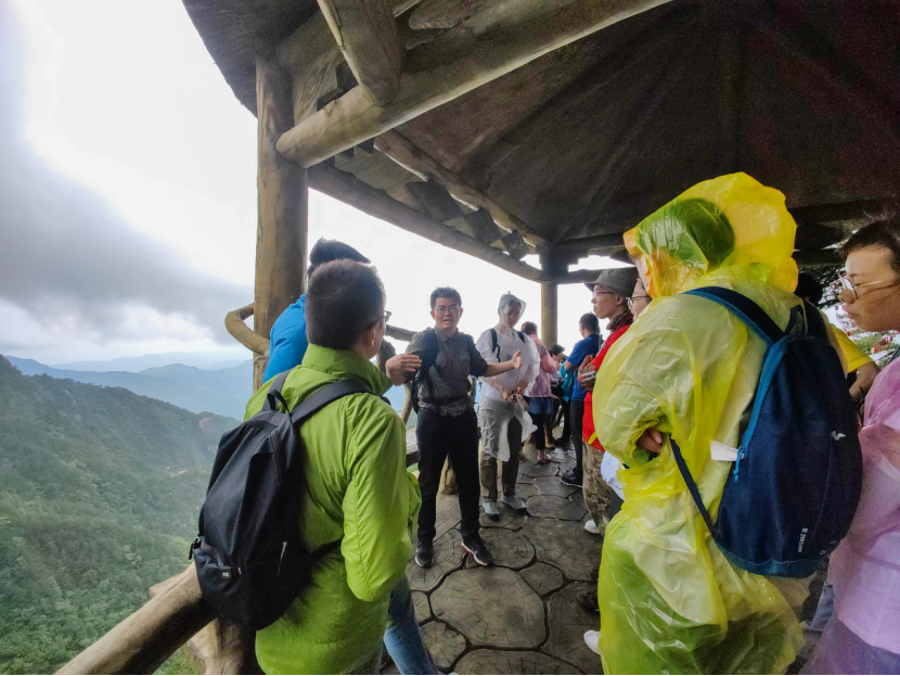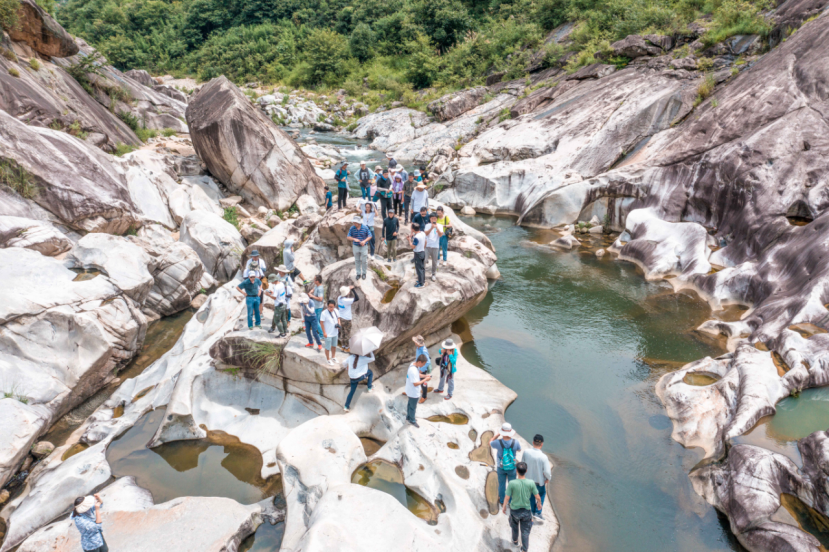 7月9日,培训班全体成员来到湖北省罗田县境内的大别山世界地质公园,该地属于典型的花岗岩地貌,形成系因扬子板块和华北板块于燕山期发生陆-陆碰撞,致使本区强烈隆升,后经构造、风化和地表水的侵蚀等多种作用的叠加而最终形成。而天堂寨景区地处大别山腹地,是由30余个不同时代、不同成因的侵入体而组成的杂岩体,汇集了花岗岩地貌和水文地质景观于一体,资源丰富多彩,并呈现出奇、险、秀、雄的地貌特色。
