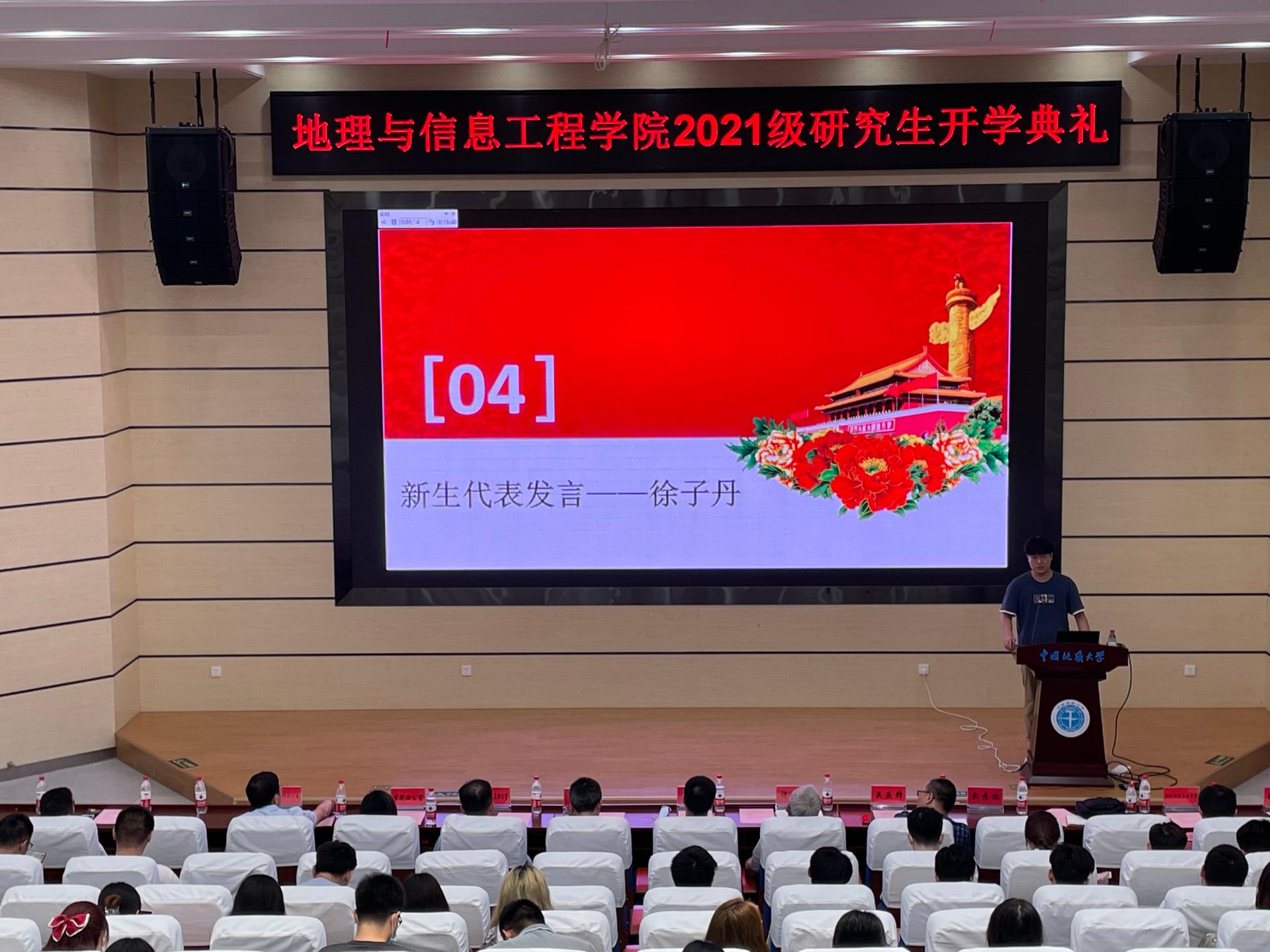 新生代表2021级电子信息专业的徐子丹同学代表所有新生表达了在接下来的学习和生活当中将会把握机会,向师者学习,以殷实的知识和素质、为人生扬帆的决心和毅力。