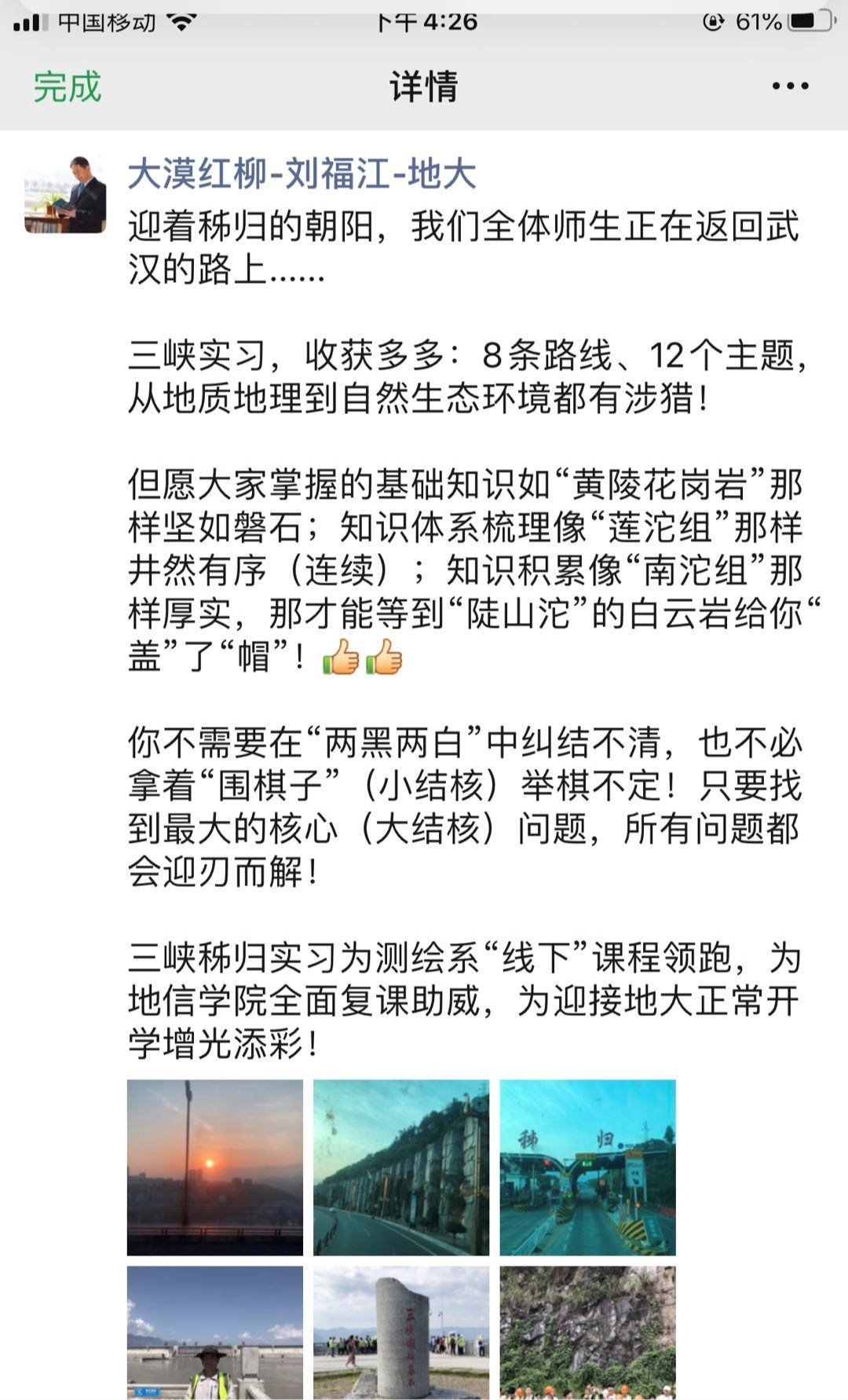 师生感触良多,很多老师和同学们都在自己的朋友圈和笔记本上写下了关于实习的点滴感悟。王广兴老师说:“今年是我第一次参加秭归野外实习,虽然辛苦,但是每条实习路线都山清水秀、风景如画,这反映了在以习近平同志为核心的党中央坚强领导下生态治理成效显著,“绿水青山就是金山银山”的发展理念深入人心,美丽湖北名不虚传。