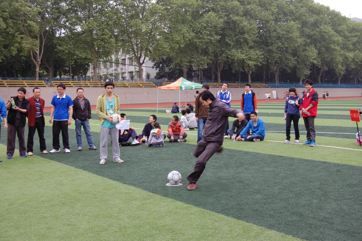 图为趣味赛项目足球射门,杨林权老师参赛中