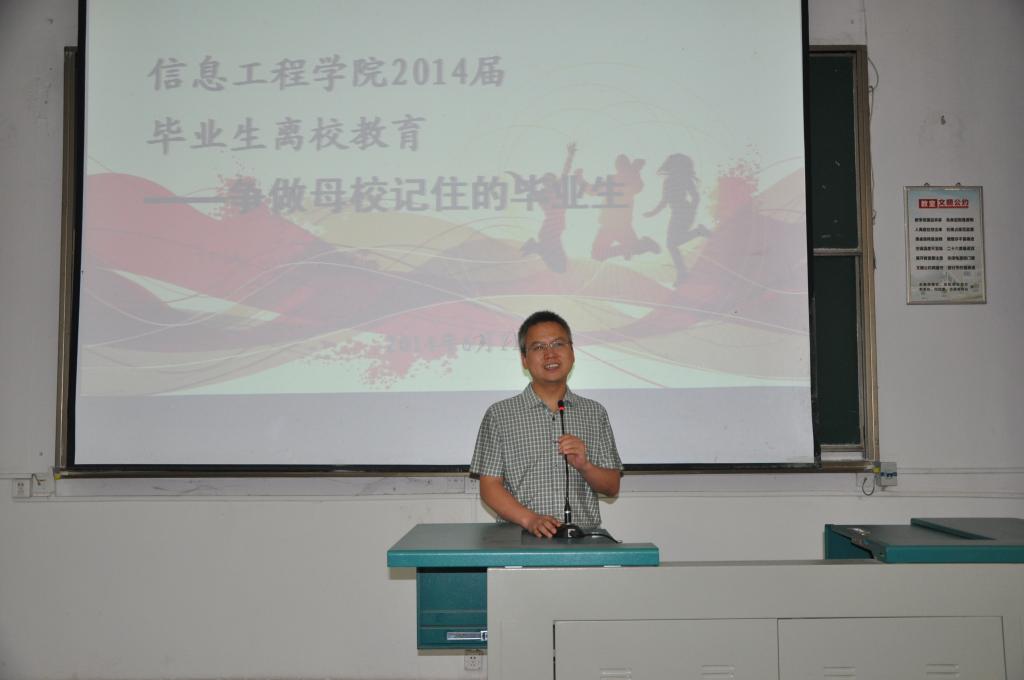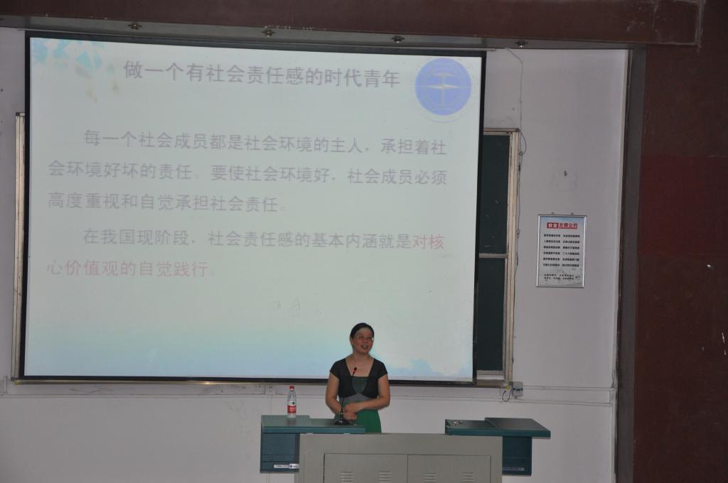 党委书记黄菊老师讲课,黄老师首先引用了习近平今年五四青年节在北京大学师生座谈会上的讲话“时间之河川流不息,每一代青年都有自己的际遇和机缘,都要在自己所处的时代条件下谋划人生、创造历史。”进而对全体毕业生指出,当代青年的历史责任,是做一个有社会责任感的时代青年。黄老师说,青年的价值取向决定了未来整个社会的价值取向,所以,同学们应该在将来的社会生活中主动践行社会主义核心价值观。青年践行社会主义核心价值观的过程,是励志的过程、修德的过程,也是更好地实现自己人生价值的过程。黄老师给大家详细地介绍了社会主义核心价值观的内涵,从公民层面的价值要求出发,告诉同学们要爱国、敬业、诚信、友善。具体的践行方式是勤学、修德、明辨、笃实。最后,黄老师用温家宝校友在2012年5月19日回母校时的讲话结束,希望全体毕业生铭记“母校培养了我,我要用我自己工作的成绩来报答母校,决不辜负母校对我的期望。”