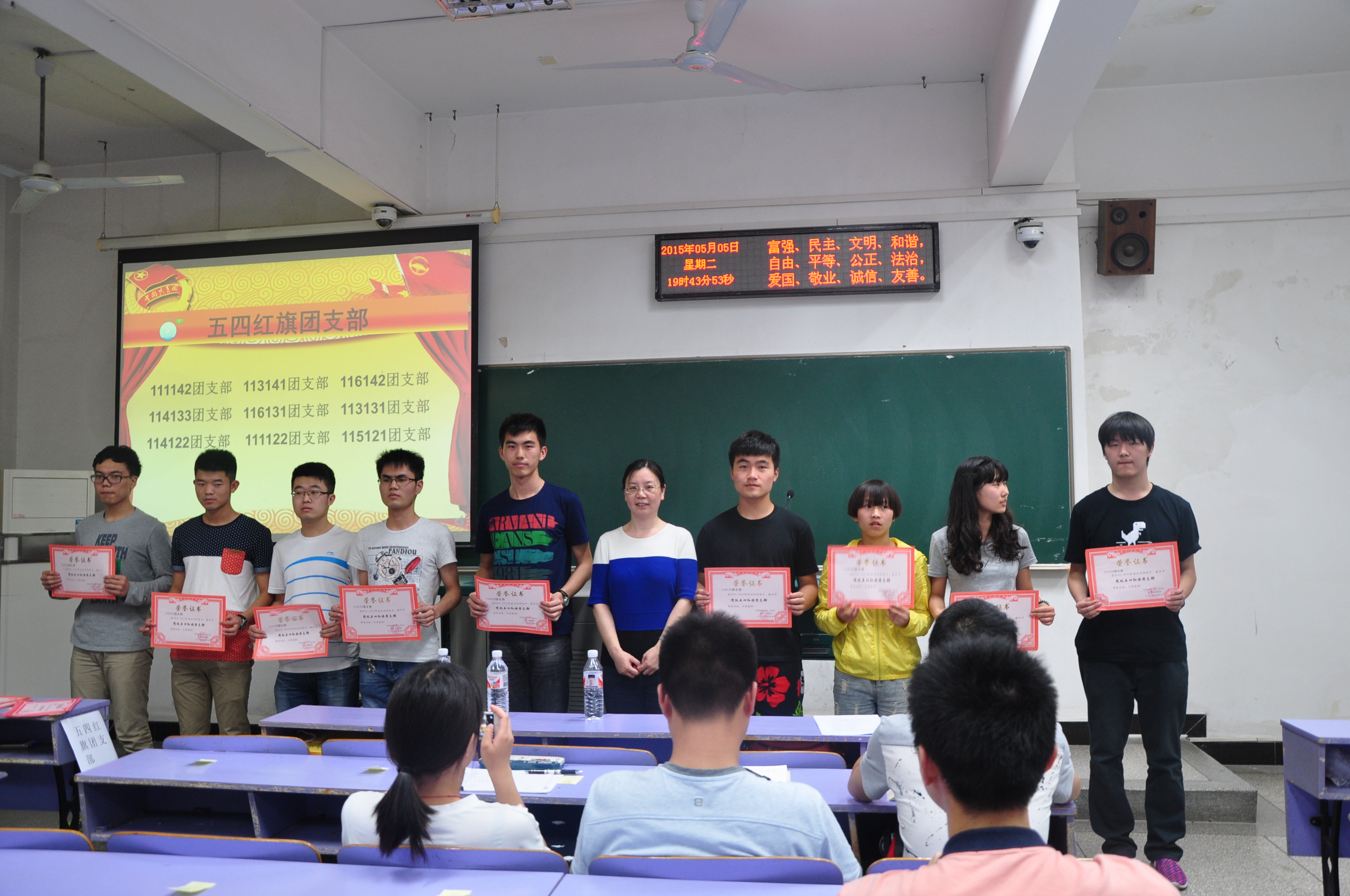 大会第一项,由武彦斌老师介绍到场领导、老师,并致开幕词。大会第二项,全体起立,奏中华人民共和国国歌。大会第三项,由黄菊老师宣布表彰决定。大会第四项,由黄菊书记和各位学工组老师分别为五四红旗团支部、特色团支部、优秀志愿服务班级、特色团队、学习标兵、百好班长支书等获奖集体和个人颁发荣誉证书并合影留念。