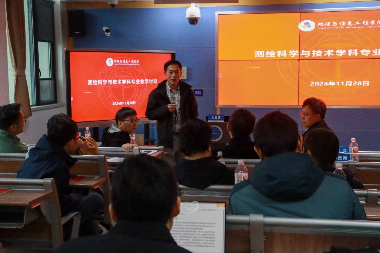 学科专业建设研讨会由徐景田主持。秦昆教授作了题为《面向国家需求的世界一流遥感人才培养体系创新与实践》的报告,从教学团队建设、课程体系和教材体系建设、科研与人才培养融合协同发展模式、学生创新实践、国际化遥感人才培养等多个方面,全面介绍了其历时10余年完成、荣获“国家级教学成果一等奖”的教学研究成果。黄海兰教授报告作了题为《教学创新暨课程思政建设经验分享》的报告,从课程思政建设文件解读、课程思政创新总体设计、课程思政创新课堂设计、教学创新大赛理解感悟四个方面详细介绍了团队荣获第三届全国高校教师教学创新大赛课程思政组一等奖的宝贵经验。亢孟军副教授作了题为《武汉大学GIS专业2024培养方案解读与实践》的报告,从大学基本智能、学科与专业、地理信息类专业核心课程体系等方面详细介绍了作为国家级一流本科专业建设点在本科培养方案调整方面的诸多经验。