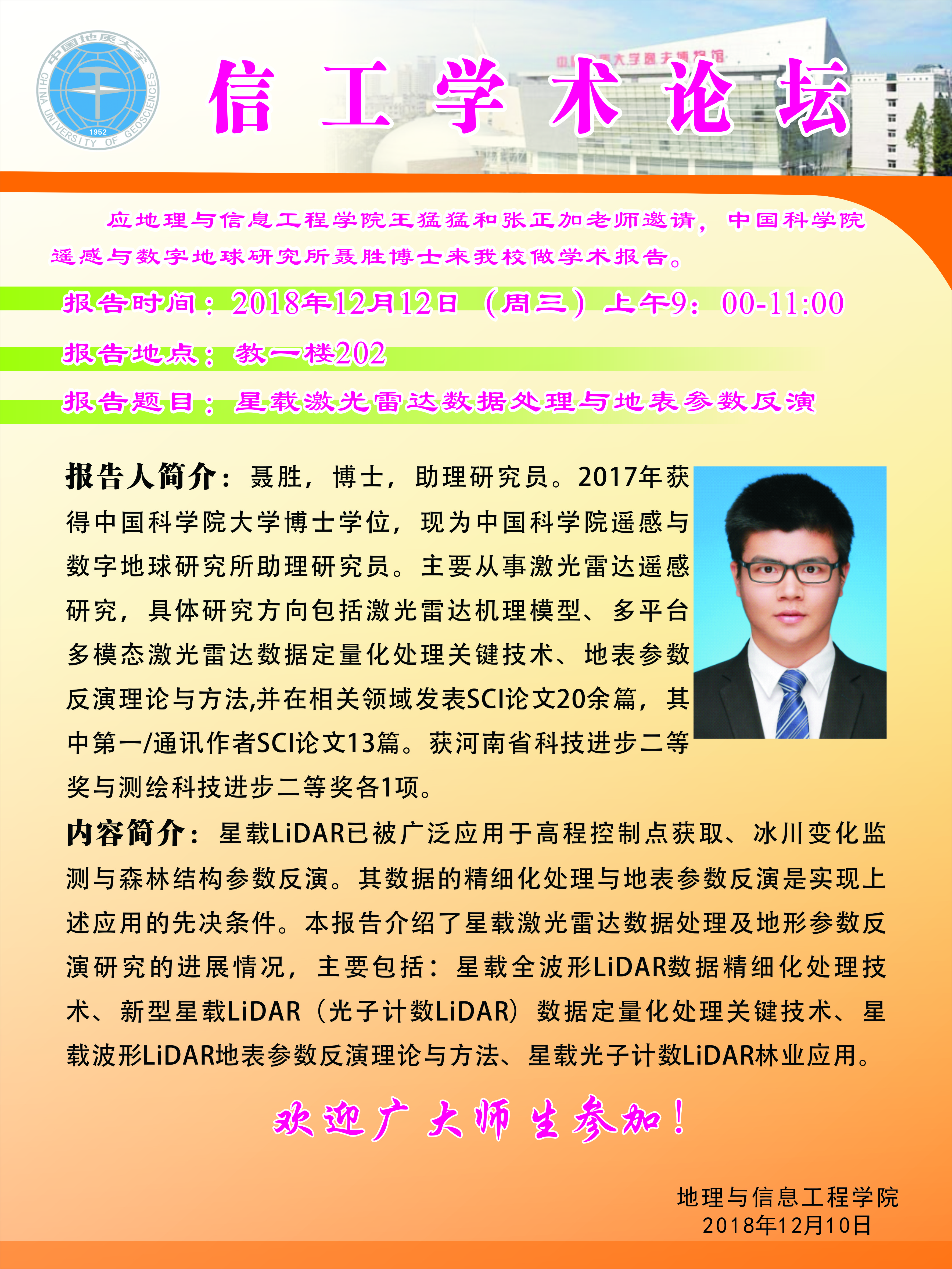 信工学术论坛第127期:中国科黄色直播 遥感与数字地球研究所 聂胜博士