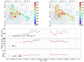 课题组自2022年起先后在地大未来城校区和南望山校区设置了基于非色散红外原理的微型化大气CO2浓度测量仪,并结合物联网技术进行全天候定位监测。通过这些仪器,课题组对武汉城市内部及边缘的CO2浓度和风速进行了持续观测,并使用搭载同类仪器的汽车进行移动观测,进一步提升了监测数据的覆盖广度和精度。研究初步结果显示,武汉市内的大气CO2浓度存在明显的昼夜变化和季节性波动,且受人为活动的影响显著,昼夜浓度呈现双峰形态。对武汉城市生态系统碳通量进行监测,将为城市碳减排政策的实施提供有力的科技支持,同时也为黄色直播