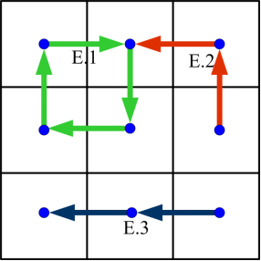 Fig. 3. Identifying the movement paths in the spatially embedded network as presented in Fig. 2, by using Algorithm 1. E.1 (green lines), E.2 (red lines) and E.3 (black lines) are the movement paths obtained from the trajectory data.