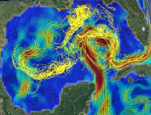 图 1. 海洋环流与交通频繁路径比较。(Blue lines indicate the type of ‘path’ with different origin and destination, and red lines indicate the type of ‘cycle’ with the same origin and destination.)