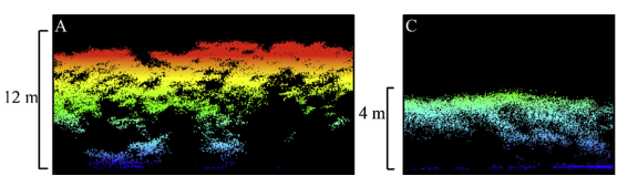 图3. 海莲(图A)和红海榄(图C)激光雷达点云垂直剖面图。