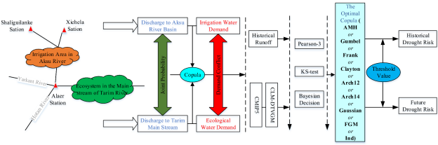 先导A项目和国家自然科学资金的支持,本研究着眼于中国“一带一路”经济发展政策沿线-塔里木河流域,从该流域上游绿洲农业用水严重挤占中下游生态用水的事实出发,借助于水文资料、CMIP5数据和CLM—DTVGM(Community Land Model-Distributed Time Variant Gain Model,陆面模式-时变增益模型)水文模型,权衡流域内的绿洲农业发展和生态发展,以径流多年均值为阈值,基于贝叶斯方法确定了最佳的Copula函数形式。随后,基于最佳的Copula函数形式确定了山区来水量及上游向中下游输水量的联合分布关系,以通过K-S(Kolmogorov-Smirnov)检验的Pearson-III概率分布为边缘分布,确定了塔里木河流域历史水文干旱风险和未来三种气候情景下(RCP2.6,RCP4.5,RCP8.5)水文干旱风险,具体研究思路见图2。