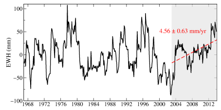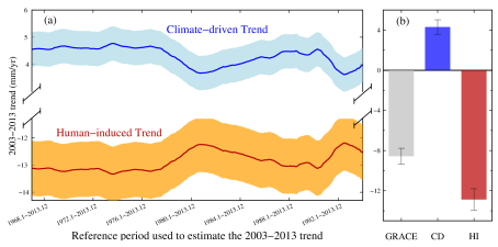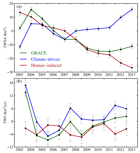 由于海河流域(华北平原)是我国最大的地下水漏斗,本研究以海河流域作为案例研究。研究显示,2003-2013年,气候变化导致海河流域陆地水储量增加,速率为4.31 ± 0.72mm/yr(每年13.8亿吨),同时期人为影响的陆地水储量亏损速率达到−12.87 ± 1.07 mm/yr(每年-41.2亿吨),要大于GRACE单独观测到的亏损速率−8.56 ± 0.79 mm/yr(每年-27.4亿吨)。单独使用GRACE监测陆地水储量变化,可能会低估区域陆地水储量变化的形势。与之前的研究相比,我们研究表明基于陆表模式估计的气候驱动的陆地水储量变化估计低估了气候影响的趋势。本文提出的方法可以用于解译长期的陆地水储量变化,更好的评估区域人为活动影响下的水资源变化。