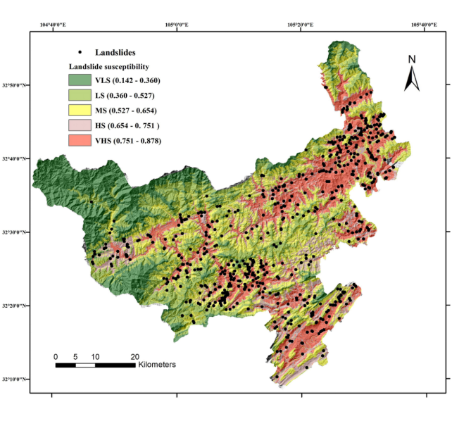 滑坡预测的相关研究中,相当重要的一步就是滑坡敏感性图的制作,即滑坡敏感性区域预测。滑坡敏感性图是一种专题图,标注了当前区域各位置发生滑坡概率的大小,并根据概率的大小进行了危险性分区。该敏感性图能在政府关于土地规划,路桥修建,灾害防治等领域的决策上发挥重要作用。