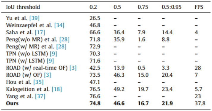 在公开的数据集(UCF101-24、JHMDB和AVA)上进行了大量的实验,对比现有的方法,本研究在定位精度和速度上都有较为出色的表现。实验环节包括了光流网络比较、融合方式比较、行为时空定位的精度和速度比较。