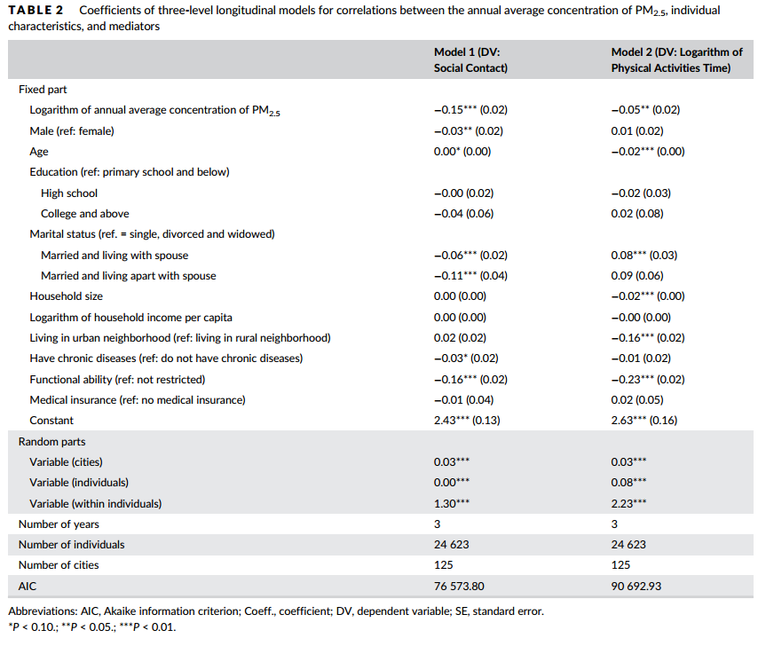 结果:在添加中介体之前,老年人的抑郁症状随PM2.5的年浓度增加而加重(Coeff = 0.57,SE = 0.11)。但在添加介体后,其抑郁症状随PM2.5的年浓度系数降低而减轻(Coeff = 0.37,SE = 0.10)。 同时体育活动(边缘检验Z得分= 2.37,P值= .02)和社交接触(Z得分= 7.33,P值= .00)均对PM2.5与抑郁之间的关系存在中介作用,其中介作用随PM2.5的增加而减弱。