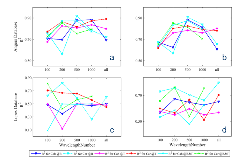 但是结果表明采用上述反演策略分析Cab和Car时,模型并没有得到有效的改善(图1);而且结合光谱(R&T)在模型中也没有体现出明显的反演优势;反而在选取新的光谱子空间后对LMA&EWT进行反演时,发现模型表现有些许改善(图2),尤其是对于光谱库ANGERS而言,模型的R2可以有原来的低于0.4提高到接近于0.6。