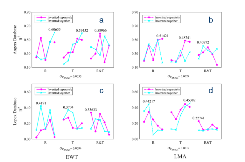 图2 同时-单独反演策略在LMA、EWT分析中的表现,反演时的敏感波段选取为三个不同范围,即750-950, 1300-1700, and 1850-2000 nm,共753个波段。a,c代表同时反演,b,d代表单独反演