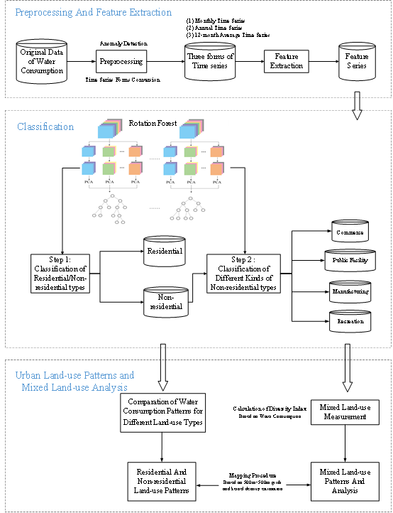 研究提出一个框架,基于用水模式分类来描绘和分析城市地区的混合土地利用首先对原始用水时间序列中的异常值进行检测和处理,将原始时序转换为具有不同的时间粒度和跨度的三种形式,并从中提取了一组特征来表示用水模式。然后,通过两步旋转森林分类器进行分类。第一步将客户分为居民和非居民。第二步将非居民客户进一步分为社会经济功能的四种类型:商业,公共设施,制造业和娱乐业。最后结合用户地理位置,基于网格划分来描绘和分析城市土地利用模式,从而获取了土地利用的混合模式,并分析其长时间跨度内的时空动态。