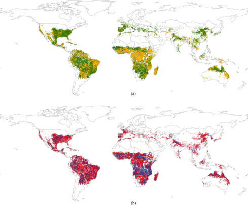 图2.(a)全球干旱的像素级总体趋势图,(b)AVHRR VCI值的相应p值图。在(a)中,黄色和绿色分别表示下降趋势和上升趋势。在(b)中,红色和蓝色分别表示显著度(<0.1)和不显著度(> 0.1)。