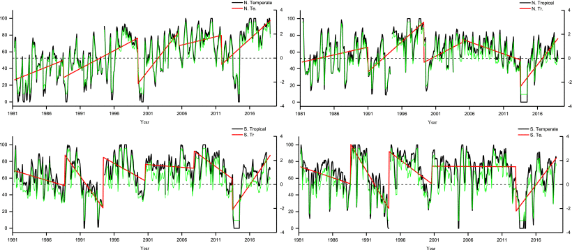 图3. 北寒带,北温带,北热带,南热带和南温带月序列和断点位置以及分段趋势,第二个Y轴用于异常值索引。