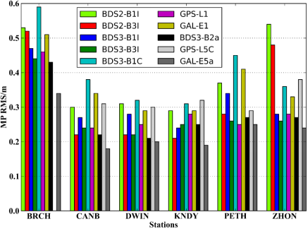 对每个测站每一频点多路径的RMS值进行统计分析(图3)。其中,北斗三号B1C频点的伪距多路径误差RMS值最大,比其他三个频点平均高出10cm左右;北斗三号的B1I和B3I频点伪距多路径误差相比于北斗二号有5-20cm的提高;在北斗二号和北斗三号系统中,B3I频点的伪距多路径误差都是最小的;B1C频点伪距多路径误差比GPS的L1频点大10cm左右,B2a频点伪距多路径误差比Galileo的E5a频点伪距多路径误差大1~9cm左右,表明北斗三号在兼容互操作频点的伪距多路径误差方面还有提升空间。