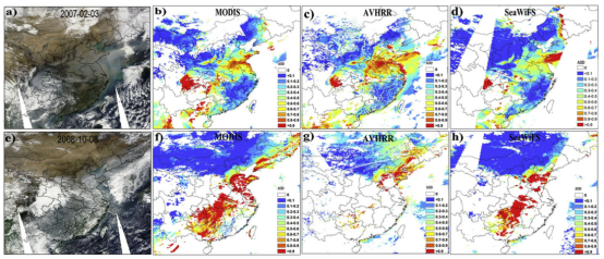 图2:a),e) Aqua MODIS真彩色图像; b),f) MODIS DB AOD; c),g) AVHRR AOD; d),h) SeaWiFS AOD, 分别于2007年2月3日和2008年10月18日在中国东部地区上空