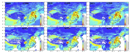 图3较低的年AOD值和反演频次表明,AVHRR过于严格的云筛选漏掉了大部分高AOD和较亮的地表条件;而对比2009-2011年质量较好的AVHRR和MODIS年均AOD(图4),也说明云筛选和反演的不同经验阈值对两者一致性有很大影响。