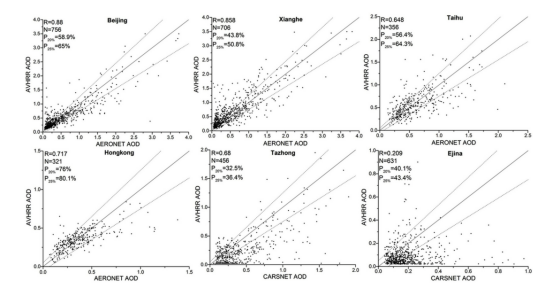 本研究将AERONET和CARSNET的6个站点结合,评估AVHRR DB反演在中国典型地表类型中的表现。此外,为检验AVHRR气溶胶反演产品与主流卫星气溶胶产品的一致性,还与已被证实具有良好量化精度的C6.1 Aqua MODIS和V004 SeaWiFS DB产品进行了比较。