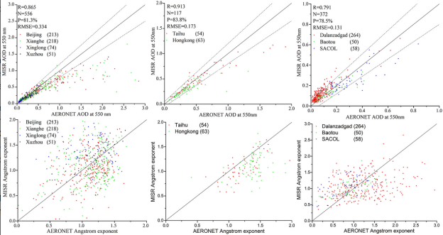 图2 MISR AOD和AERONET AOD在550 nm处的散点图;以及MISR和AERONET在860/550和675/440 nm处的埃指数散点图。虚线和黑线的预期误差包络(EE)为±(0.05 + 20%)。 还显示了匹配的相关系数(R)和数量(N),EE中的百分比(P)以及均方根误差(RMSE)。