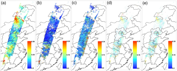 图1 MISR 550nm反演的AOD: (a)小模态、(b)中模态、(c)大模态、(d)非球面和(e)尘埃组分