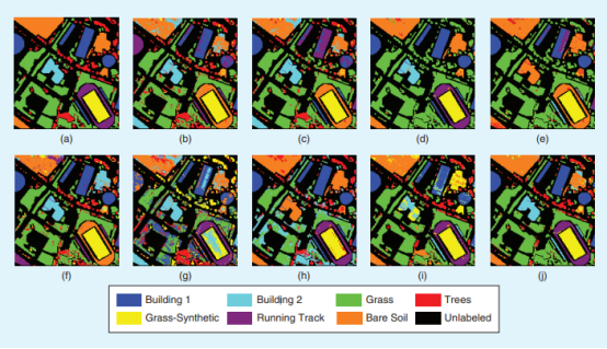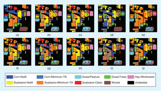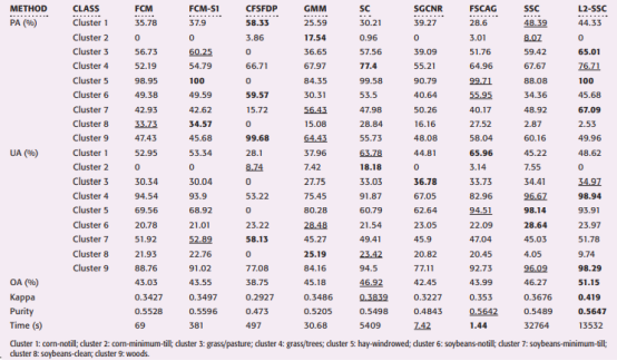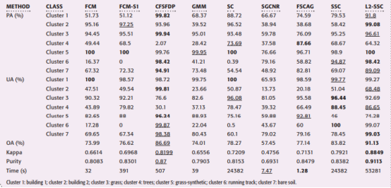 以广泛使用的美国印地安纳农场数据(Indian Pines)和2013年IEEE数据融合大赛官方发布的美国休斯顿大学数据(The University of Houston)为例,分析比较了9种典型的、具有代表性的高光谱聚类方法的性能,包括基于聚类中心的方法、基于特征空间密度的方法、基于概率的方法、基于图的方法和子空间聚类方法等。基于实验结果,本文对各种聚类方法的性能优缺点和背后的原因机制进行了详细探究。其中,各方法的聚类结果和定量评价结果如图1、2和表2、3所示: