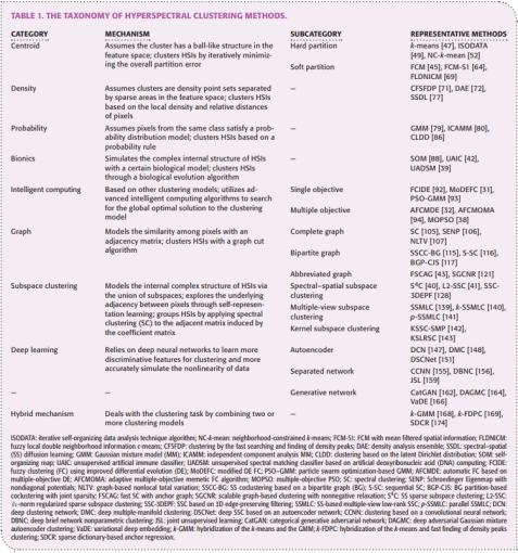 本研究发现目前高光谱聚类发展存在一定的不平衡性:基于聚类中心的方法、基于特征空间密度的方法和基于概率的方法发展较为成熟,尤其是前两类,取得了丰硕的研究成果;基于仿生学方法的研究相对较少;近些年,由于优越的聚类性能,基于图的方法和子空间聚类方法受到越来越多的关注。