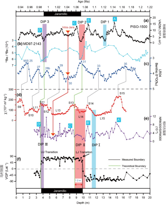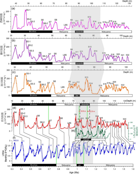 肖国桥副教授团队通过对黄土高原东南部三门峡地区两个平行黄土剖面S9-S18的地层进行高分辨率的磁性地层、相对古强度(RPI)和岩石磁学研究,并将结果与深海沉积记录的氧同位素、古地磁极性界线、RPI进行详细对比,探究了MBB和Jaramillo的理论位置及黄土古地磁极性界线错位的原因。所获得的主要发现如下: