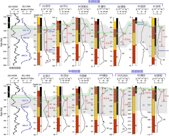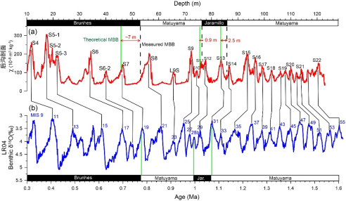 MBB代表发生在距今78万年前的一次地磁场倒转事件,具有全球同时发生的特征。在深海沉积中,MBB被记录在深海氧同位素19阶段(MIS 19)中部偏上的位置,属于间冰期。在中国黄土中,MBB却大多出现在黄土层L8的中下部,对应MIS 20,属于冰期。MBB作为一次全球性的事件,理应被海陆相沉积物同时记录在相同的气候期,但是MBB在海洋记录中却晚于中国黄土的记录。这种差别对第四纪海陆古气候对比造成了极大的困惑,阻碍了黄土精细的天文年代标尺的发展。