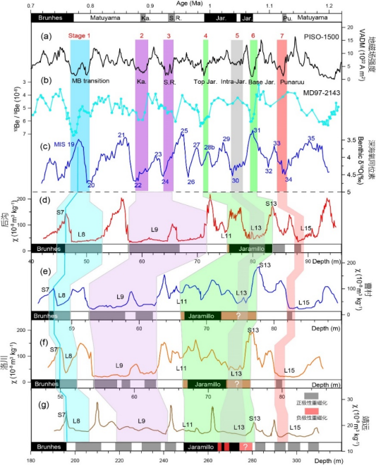 图4. 中国黄土与深海沉积的古气候指标与相对古强度(RPI)对比