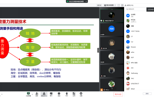 主要团队的研究方向,然后从精密重力测量技术的发展历史,到中山大学大地测量与导航团队近期的主要研究进展做了系统的交流,包括利用独立主成分(ICA)方法分离大地震、水文和海水变化信号、结合水文模式空间模态的华北区域地下水及青藏高原区域陆地水变化的卫星重力监测降尺度、Bender模式(双组重力卫星组合)监测的模拟、精密重力测量国家重大科技基础设施“华北卫星重力测量检验与标定场”建设等方面的研究进展。