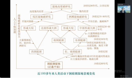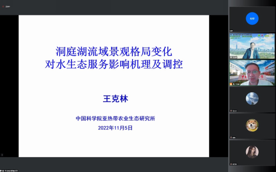 王克林研究员从国家战略与生态学科前沿驱动方面强调了开展区域生态学研究的重要性,对区域生态学发展态势及使命、研究前沿主题、研究重点和内容进行了阐述,并提到具有重要生态地位和独特水文过程的洞庭湖是开展格局-过程-服务耦合研究的理想区域。因此,该团队以洞庭湖流域为例,开展了一系列流域景观格局变化对水生态服务影响机理及调控的研究工作。该团队从景观格局动态变化入手,分析了洞庭湖流域、湖区景观格局动态变化特征及其驱动机制,对流域土壤侵蚀时空变化特征和演变趋势、湿地面积变化及关键驱动因子以及生境质量演变进行了研究。在此基础上,对流域生态水文过程、流域水质演变过程和流域水生态服务形成机理与权衡深入探讨,详细刻画了洞庭湖流域关键生态服务、水生态服务演变规律、典型子流域景观格局变化对水生态服务功能及产水生态系统服务流的影响、洞庭湖水环境演变趋势及驱动机制。同时,王克林研究员指出,洞庭湖流域退耕还林工程在恢复植被外也存在一定的负面影响,新增的林地在生长过程中受蒸发、呼吸、蒸腾等的影响消耗大量水分,一定程度上导致了流域内汇水量和湿地面积的减少。