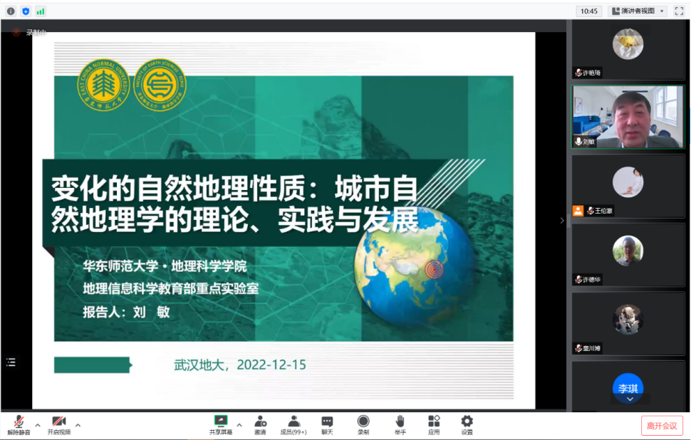(武汉)第116期名家论坛暨校庆七十周年学术交流会,以线上形式作题为“变化的自然地理性质:城市自然地理学理论、实践与发展”的学术报告,受到师生的热烈欢迎。报告由许德华书记和王伦澈教授主持,与会人数共计200余人。