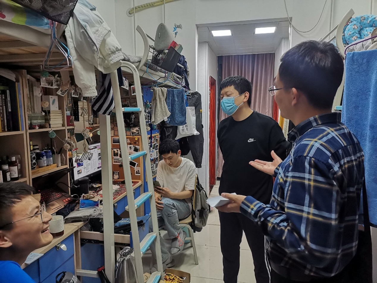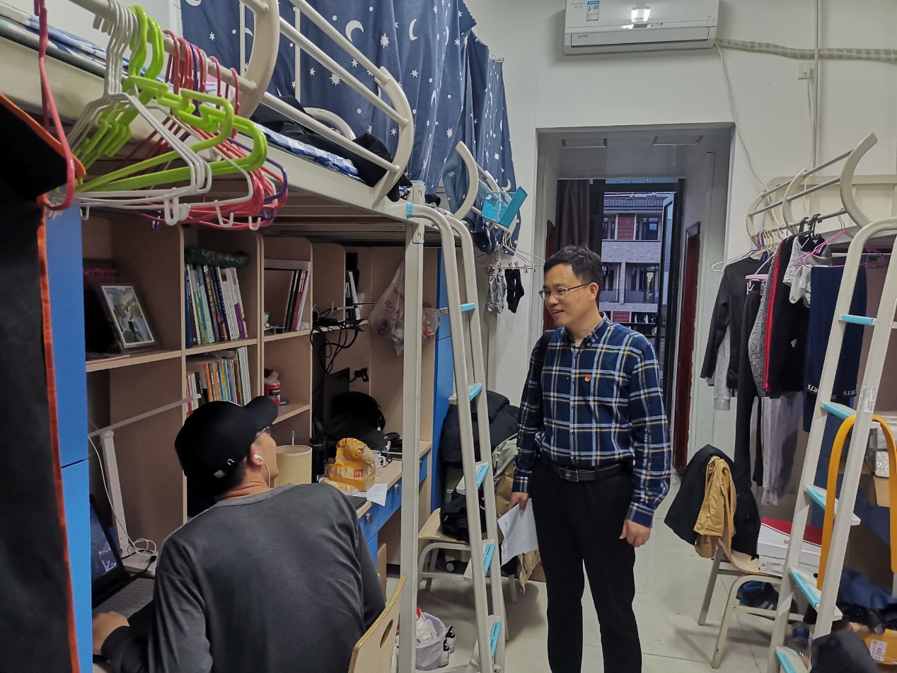 晚7点,武彦斌带队分别队男女生宿舍进行安全文明联检,向学生表达节日问候,并提醒同学们相关安全事项。晚9点,检查结束。