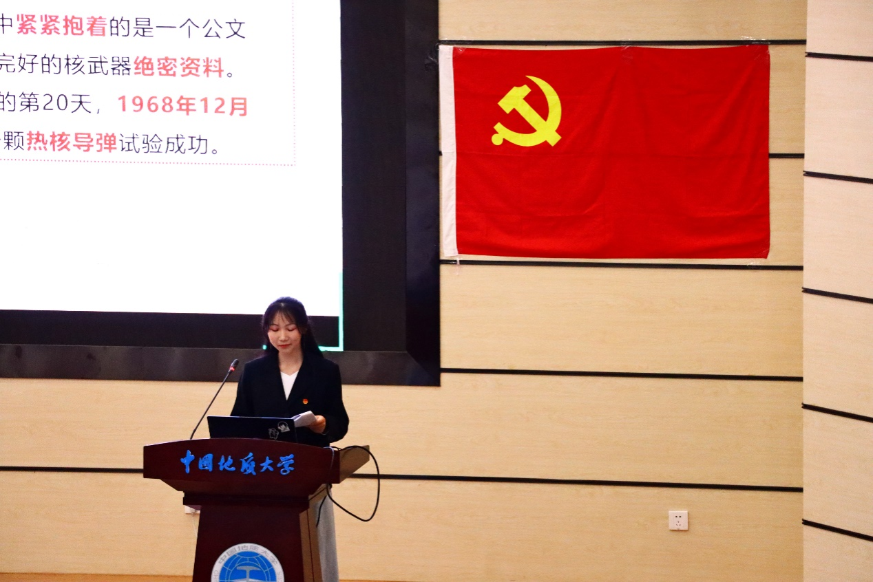 “星辰筑梦志愿宣讲团”的宣讲人何敏君主讲《弹影星辉铸党魂,精神砥砺展宏图》专题党课。何敏君讲述了“两弹一星”功勋郭永怀为了国家事业隐姓埋名、扎根大漠的感人事迹,并向广大青年学子发出倡议:重视国家安全,将个人发展与国家利益紧密联系起来,将青春和热血奉献到建设新时代的伟大事业中去。