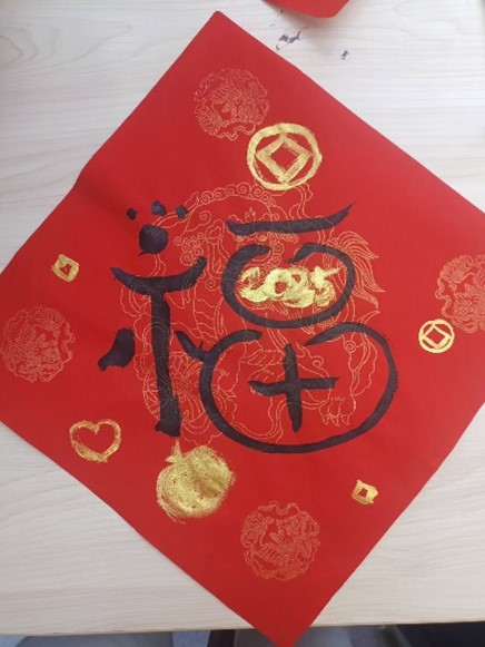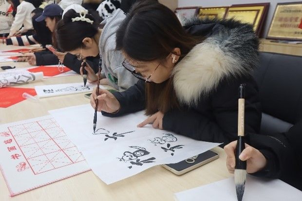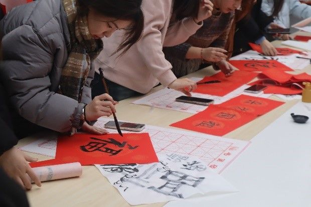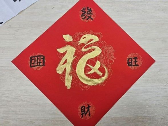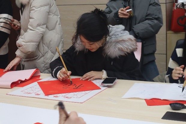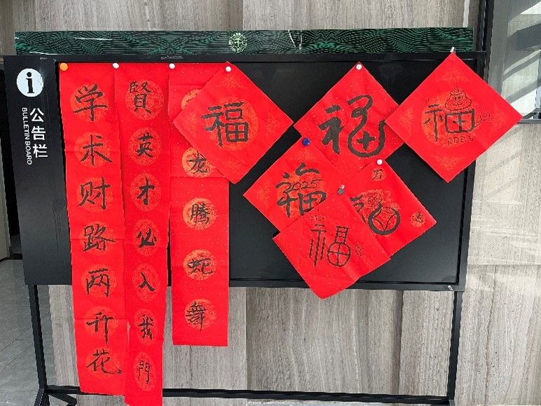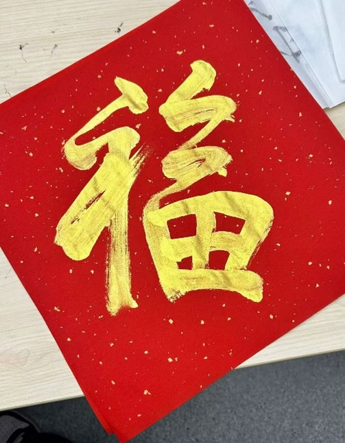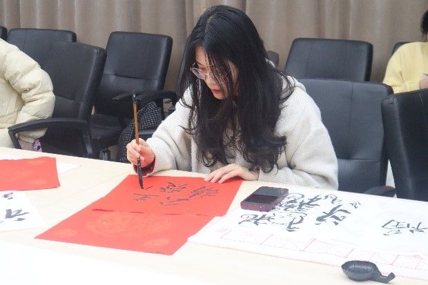 一笔一画传递祝福。在活动中,参与师生通过书法作品,在红色宣纸上写下对新年的期许与祝愿。一张张形态各异的大写的“福”字,一幅幅排比工整的对联佳句……传递着师生对美好生活的向往与追求。