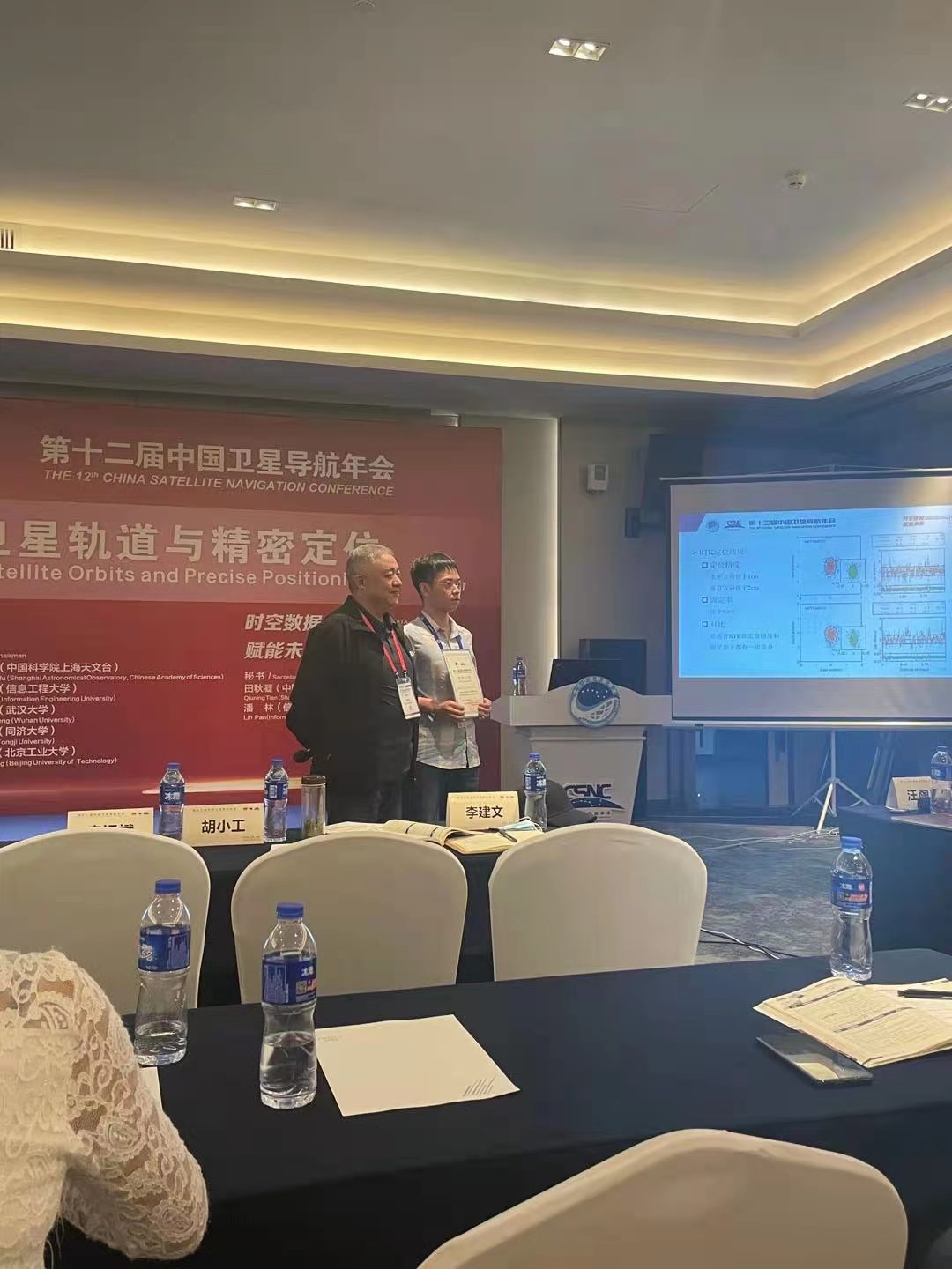 在年会开幕式上,神舟飞船总设计师、中国工程院院士戚发轫为朱松同学(下图中)颁发获奖证书并合影留念。在参会期间,朱松在学术交流“S04卫星轨道与精密定位”分会场进行报告,汇报了关于BDS-3全球服务能力、BDS-3数据质量、不同模型RTK定位算法和性能等内容,报告吸引众多专家学者参与交流提问,受到广泛关注。