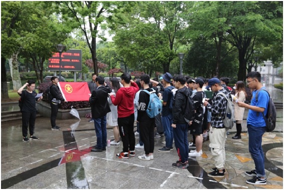 最后,参观队伍在武昌廉政公园集中,团员代表潘继蕾同学带领其他团员重温入团誓词,宋超老师做总结发言,他说到,五四运动形成的“爱国、进步、民主、科学”精神是当代青年依然应该坚守的核心价值,青年学生同祖国发展同呼吸、共命运的爱国情怀没有变也不能变,新时代我们的党要带领全国人民实现两个一百年奋斗目标,青年学生要牢固树立“四个意识”、坚定“四个自信”,做到“两个维护”,勇于承担时代赋予我们的责任和使命,为实现中华民族的伟大复兴贡献一份自己的力量!