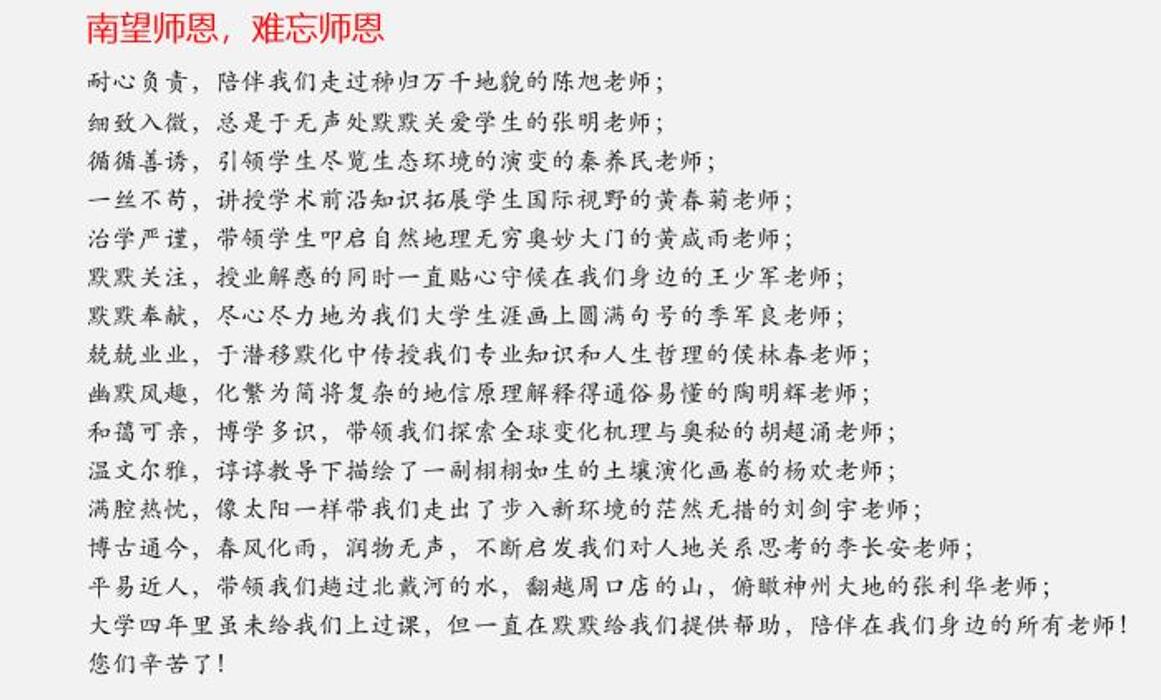 在同学们大二期间就可以提供就业方面的辅导……在同学们发言的最后主持人深情朗读了地理班肖安国同学撰写的感谢词,感谢老师们通过地理专业带领我们见识了古人类,见识了三叶虫,见识了地下沉积物,见识了沧海桑田。